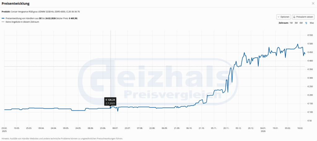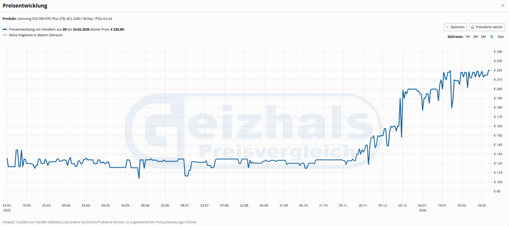 Heute hat sich der Trend ins Gegenteil verkehrt: Eine SSD-Festplatte, die vor einem Jahr für gut 100 Euro zu haben war, kostet 2026 schnell das Vier-, teils gar das Fünffache (Abbildung 1). Sogar die klassischen HDDs werden immer kostspieliger.